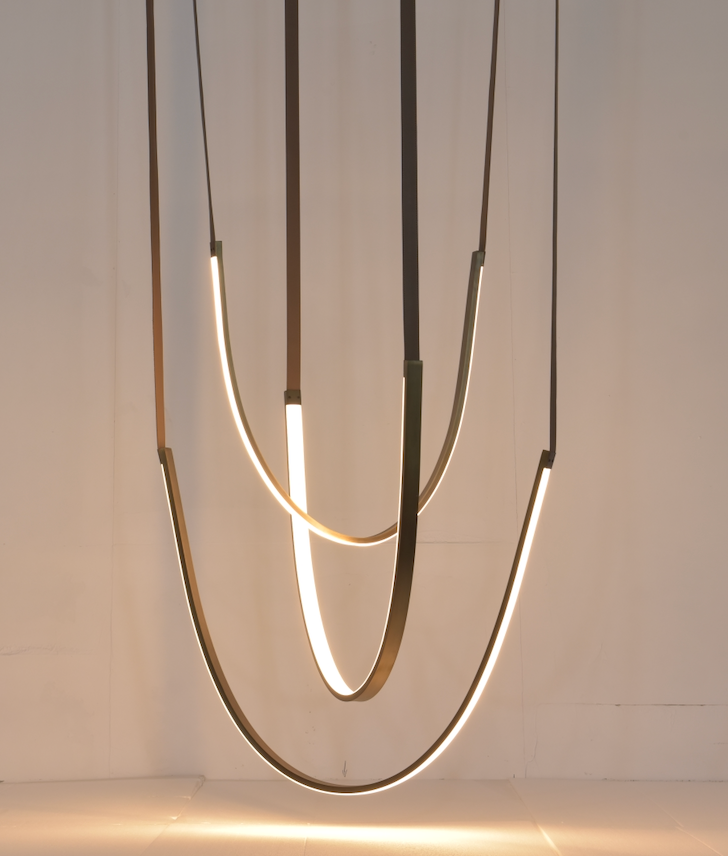 LA LÁMPARA CON UN DISEÑO INNOVADOR EN COLOR DORADO, QUE GRACIAS A SU SISTEMA LUMINOSO FLEXIBLE PODRÁ SER CONFIGURADO EN CUALQUIER FORMA DESEADA.